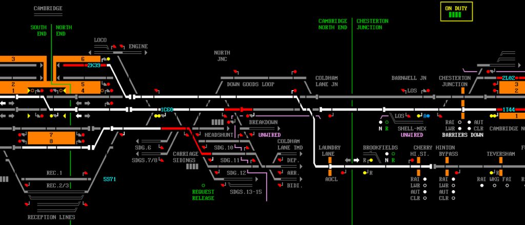 A simulation of part of Cambridge power signal box, showing the lines between Cambridge and Cambridge North. 1C60, a semi-fast to King’s Cross, is signalled into platform 1 over the…