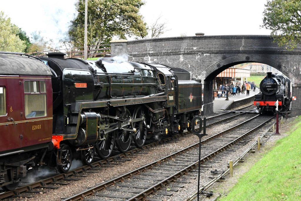 On 19th October 1991, West Country Pacific No. 34027 ‘Taw Valley’ and BR Standard Class 7 No. 70000 ‘Britannia’ stand in Cambridge Coalfields Yard. Photo Copyright David Scudamore. A record…