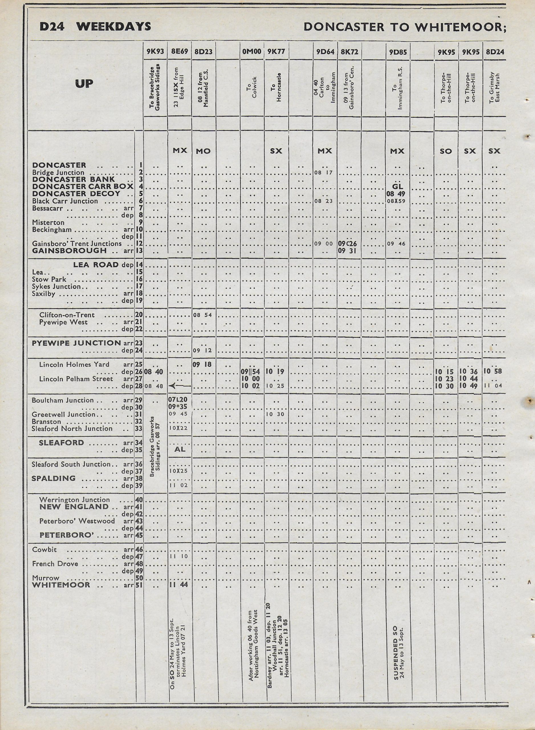 May 1969 BR Eastern Region Working Time Table Section D (Lincoln Area) page D12 showing 9K79, 14.03 (SX) Horncastle to Lincoln Holmes Yard which arrived at Woodhall Junction at 14.48. It departed at 15.20, calling at Bardney from 15.53 to 16.31 where it passed both the 16.00 Lincoln Central to Tumby Woodside and the 15.22 Firsby to Lincoln Central which crossed in the station. After joining the Joint Line at Greetwell Junction at 17.07, 9K79 did not travel via the Lincoln Avoiding Line to reach Holmes Yard, but went over Pelham Street Crossing and through Central Station to arrive at Holmes Yard at 17.17. Photo: Alan Jones.