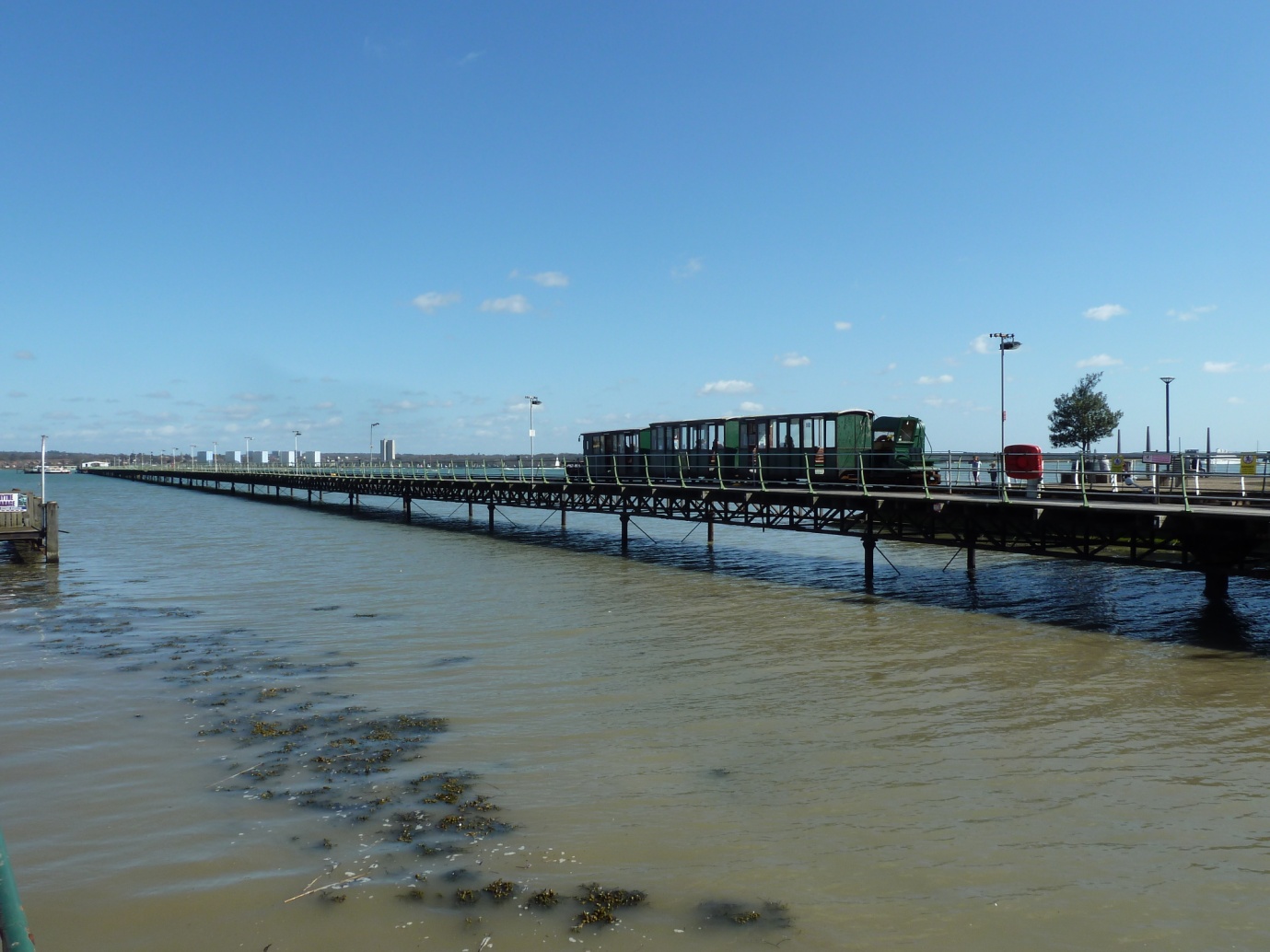Hythe Pier stretches 640 meters (700 yards) from Hythe shore into the deep water channel of Southampton Water. It is approximately 4.9 m (16 ft) wide, and carries a pedestrian walkway and cycleway on its northern side and a 610 mm (2ft) gauge railway track on the southern side.