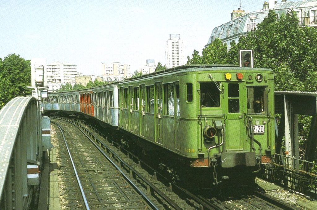 Sprague-Thomson train on line 2 departing from Jaurès heading west to Porte Dauphine, comprising each of the three liveries. The normal livery was green for second class and red for first class. The ‘grey’ (second class) cars were specifically for line 1, but when that line was converted to rubber tyred operation in the 1960s, its stock was redistributed to other lines. Image Credit: Brian Hardy.